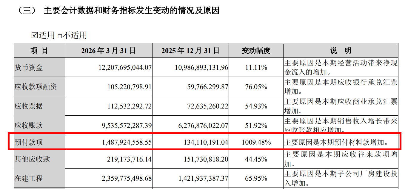 财联社4月16日电,中际旭创(300308.SZ)公告称,2026年第一季度实现营业收入194.96亿元,同比增长192.12%;归属于上市公司股东的净利润为57.35亿元,同比增长262.28%。业绩变动主要系受益于终端客户对算力基础设施的强劲投入,公司产品出货持续增长。小财注:公司Q1净利润57.35亿,2025年Q4净利润36.65亿,据此计算,Q1净利润环比增长56%。据公告披露,公司本季度上游材料预付款暴涨10倍,达到14.9亿元,远超去年底的1.3亿元。