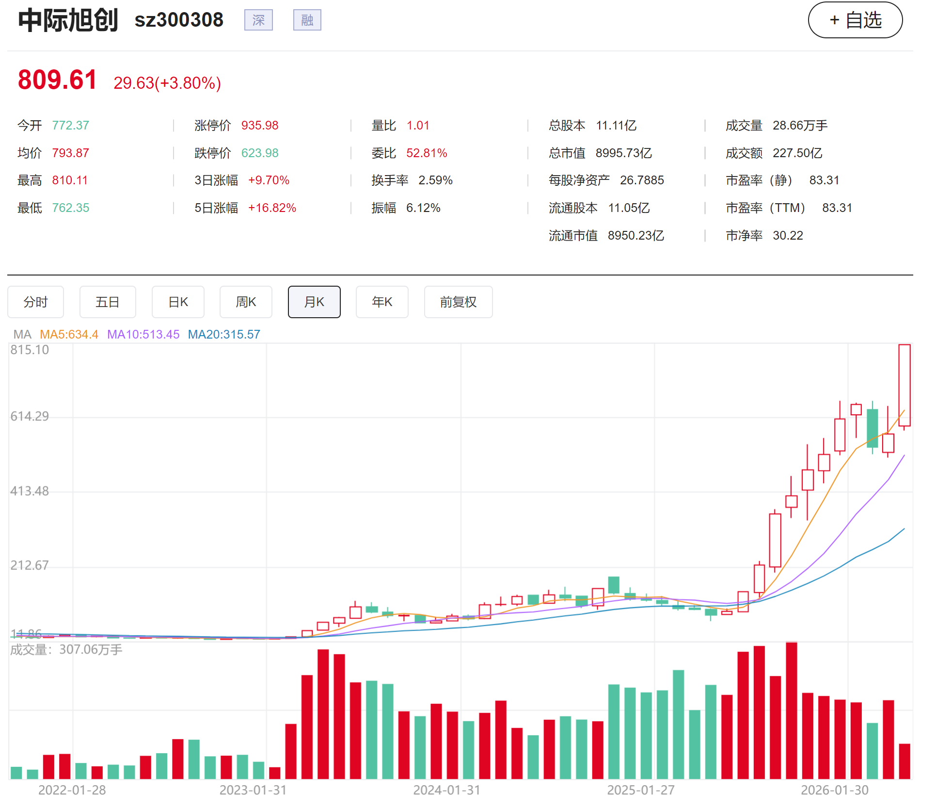 中际旭创股价今日收涨3.8%,股价报收809.61元,总市值逼近9000亿元关口。在去年涨近4倍的基础上,该股今年涨超30%。