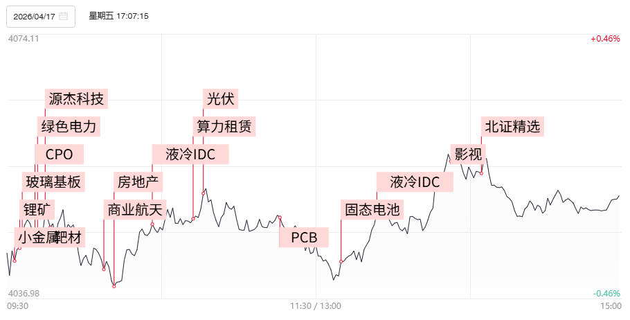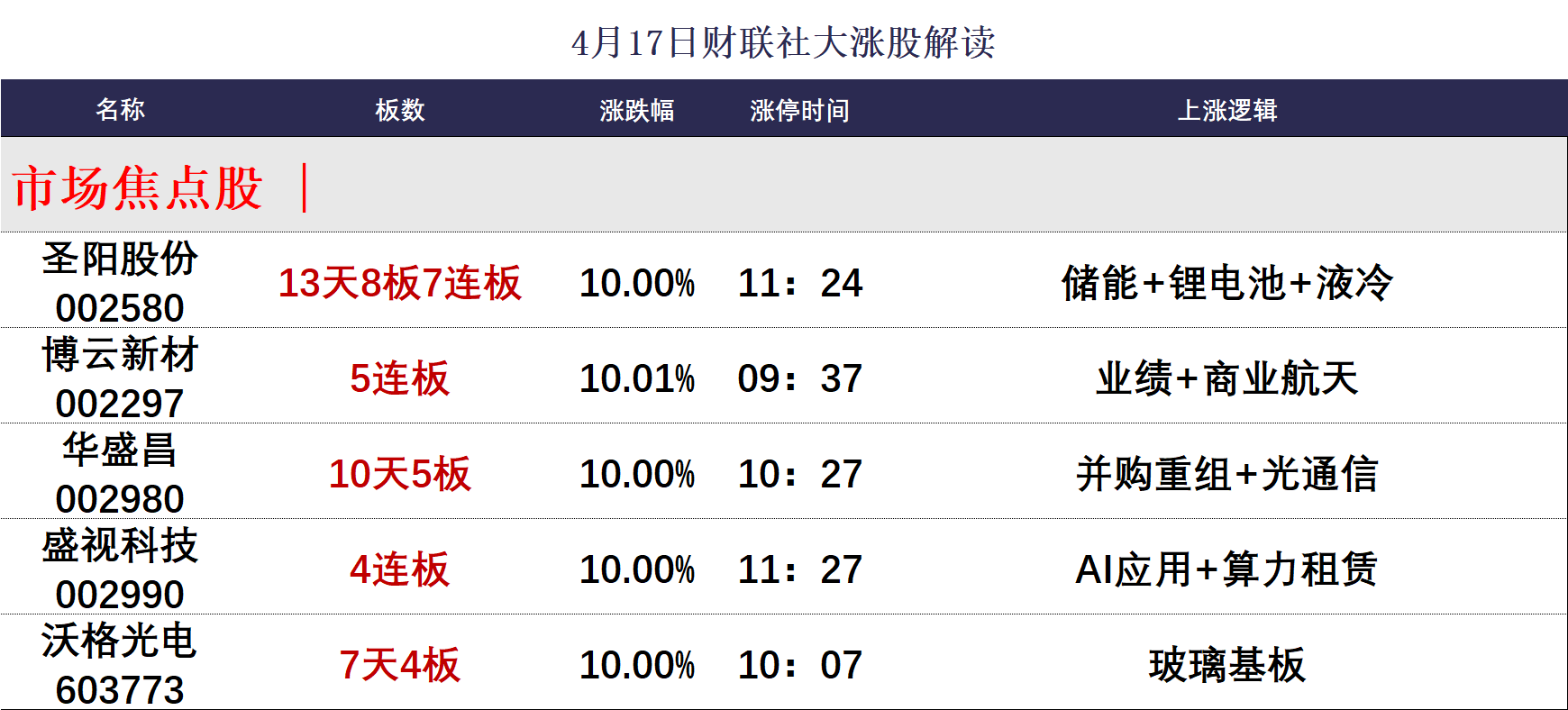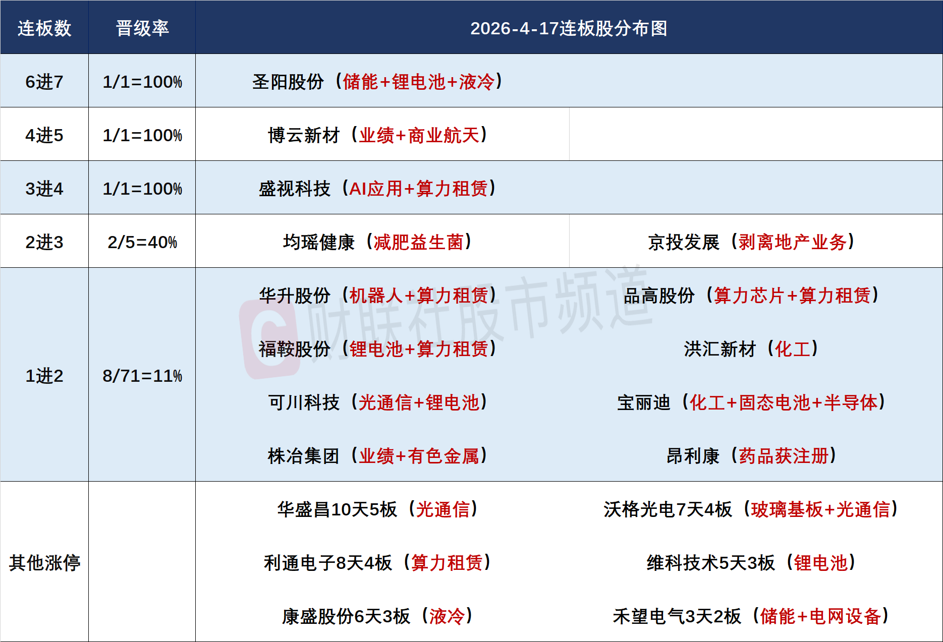 财联社4月17日讯,今日71股涨停,20股炸板,封板率为78%,圣阳股份7连板,博云新材5连板,盛视科技4连板,京投发展、均瑶健康3连板,华盛昌10天5板,沃格光电7天4板,利通电子8天4板,科瑞技术9天4板,维科技术5天3板,华升股份、康盛股份6天3板,北交所凯华材料、创达新材30cm涨停。三大指数涨跌不一,沪指窄幅震荡,创业板指涨超1%,再创近11年新高。沪深两市成交额2.43万亿,较上一个交易日放量839亿。盘面上,市场热点快速轮动,全市场近3000只个股下跌。板块方面,玻璃基板、CPO、风电设备、PCB概念领涨;旅游酒店、酿酒、煤炭、化工板块领跌;截至收盘,沪指跌0.1%,深成指涨0.6%,创业板指涨1.43%。