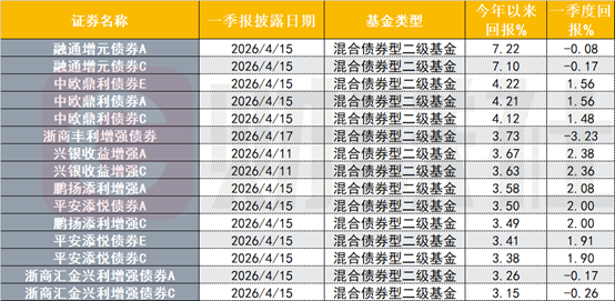 混合债基在一季度受到冲击,但进入4月后迅速修复。已披露一季报的混合债基中,有产品一季度收益为负,但最新年度回报已升至7%。多只混合债基均在一季报中表示,美伊冲突带来的不确定性逐渐淡化,二季度权益市场的机会大于风险。