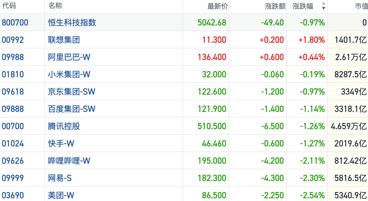 盘面上,大型科网股整体转弱,美团跌超2%,小米、京东、百度、腾讯飘绿,阿里巴巴收盘微涨。