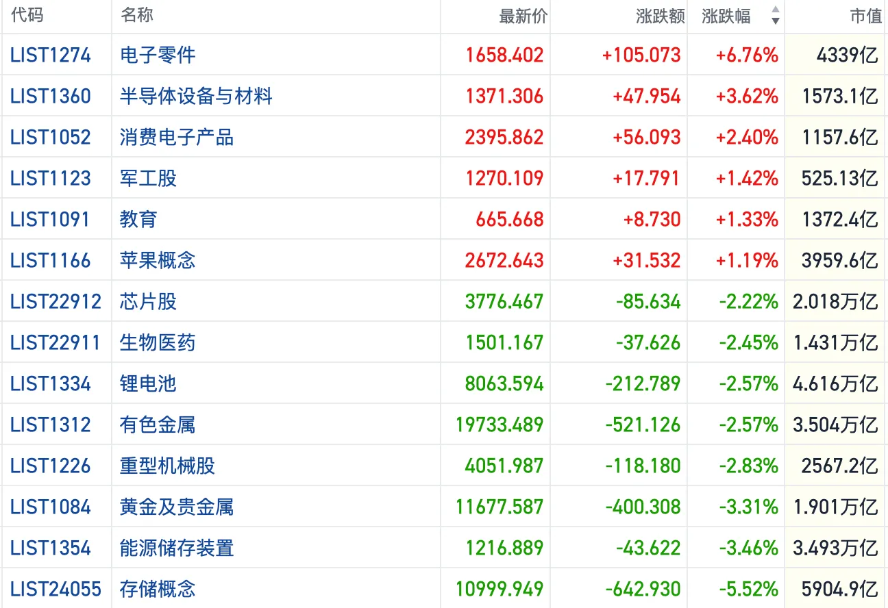 今日下跌的板块中,存储、储能、锂电等短线高位板块集体调整,部分资金主动向切换家电、教育等低位标的切换。