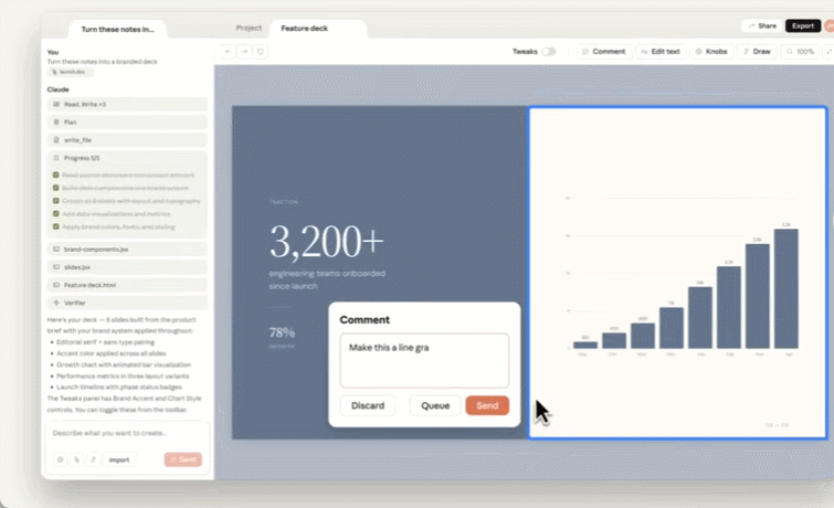 据公司介绍,Claude Design由周四刚上架最新旗舰大模型Claude Opus 4.7驱动,主要面向“有想法但没有设计背景”的人群,可以凭借自然语言提示和历史资料库创建“精美的视觉作品”,例如设计稿、产品原型、幻灯片、单页介绍等。