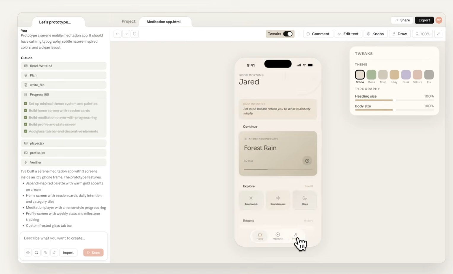 举例而言,用户可以让Claude提供一款“冥想应用原型”,要求AI使用“能让人平静的排版、细腻的自然风格配色和简洁的布局”。