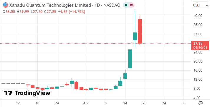 根据监管文件和市场数据,截至当地时间周五(4月17日)中午,Christian Weedbrook持有的Xanadu股份价值达到约15亿美元。即使股价周五有所回落,本周涨幅仍超过200%。