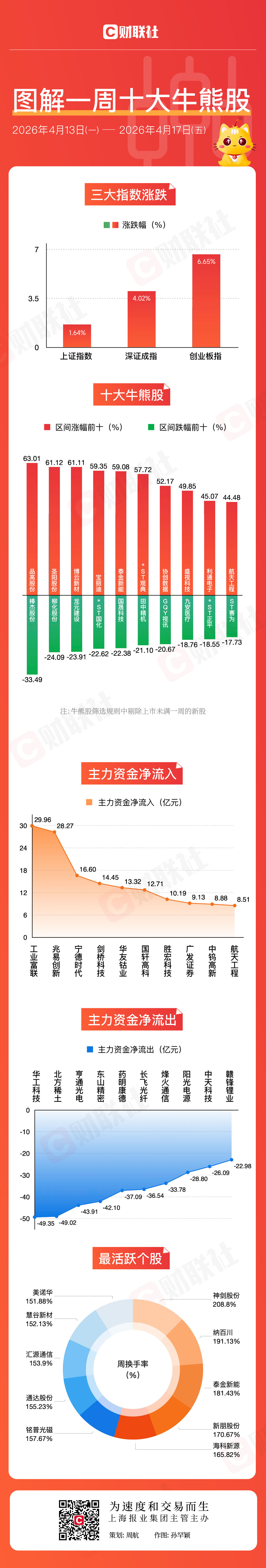 财联社4月18日讯,本周A股三大指数反弹拉升,其中上证指数周涨1.64%,深成指周涨4.02%,创业板指周涨6.65%,本周创业板指创近11年新高。本周能源金属、电池、电子化学品板块涨幅居前,CPO、PCB、液冷服务器概念股表现活跃。