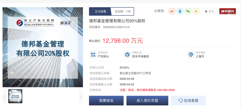 浙江产权交易所近日披露,浙江土畜集团所持德邦基金20%股权正挂牌转让,转让底价为1.28亿元,信息披露期为今年4月9日至4月22日。相较首次挂牌,此次转让底价下调近10%。即使售价打折,德邦基金股权的吸引力仍显不足,二次挂牌目前仍未征集到意向受让方,挂牌时间目前已自动延长了1个周期,即5个工作日。