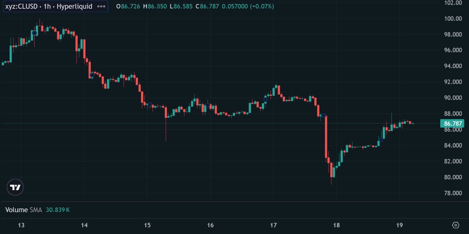 区块链上交易的WTI石油合约显示,“链上美油”在周五一度跌破80美元/桶后,周日清晨已经反弹回86美元。
