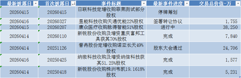 3、本周科创板并购最新进展共7条:日联科技定增收购菲莱测试部分股权、昱能科技收购天通优能22%股权、康众医疗收购脉得智能51%股权、新锐股份收购及增资重庆富邦工具获其70%股权、普冉股份定增收购诺亚长天49%股权、纳微科技收购及增资纳信科技获其51.25%股权、新锐股份收购株洲韦凯19.1618%股权,其中第一条属于本周首次披露。