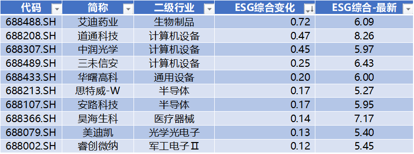 上表是ESG评分变化上升的前十家公司(剔除新上市公司),分别为:艾迪药业、道通科技、中润光学、三未信安、华曙高科、思特威-W、安路科技、昊海生科、美迪凯、睿创微纳。