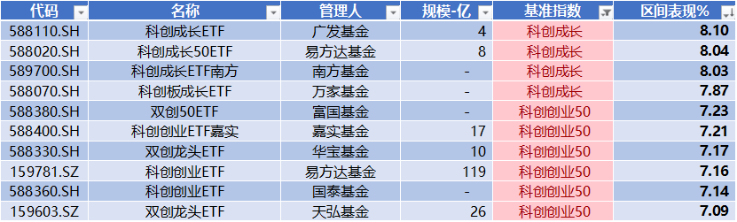 上表是本周市场表现按照降序排列的科创板ETF基金,本文选取前十名。本周科创板ETF中,成长与双创50主题ETF表现居前。