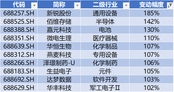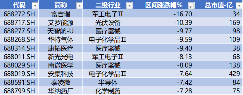 上表是本周跌幅榜前十公司,分别为:富吉瑞、艾罗能源、天智航-U、华特气体、康拓医疗、新光光电、南微医学、安集科技、泰凌微、华纳药厂。