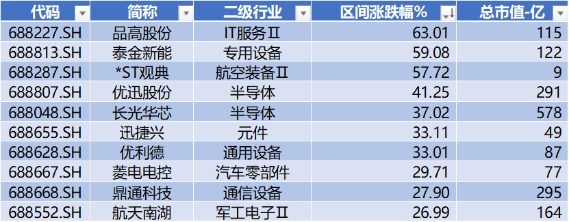 上表是本周涨幅榜前十公司,排名前十的公司分别是:品高股份、泰金新能、*ST观典、优迅股份、长光华芯、迅捷兴、优利德、菱电电控、鼎通科技、航天南湖。