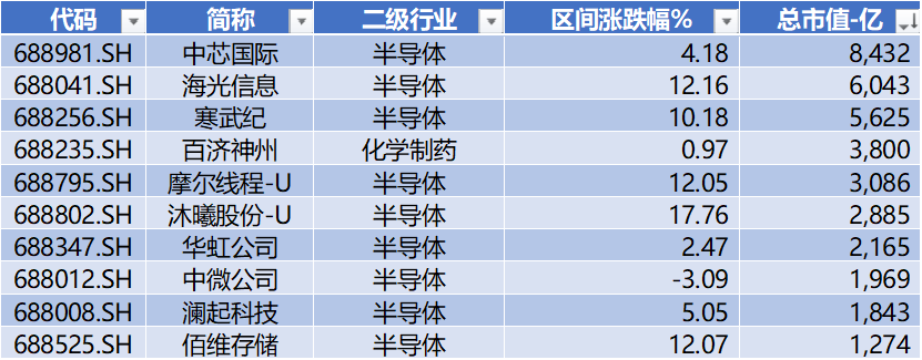 上图是本周科创板前十大权重公司呈现大部分上涨,其中沐曦股份-U上涨17.8%居前,中微公司是唯一下跌的权重公司。