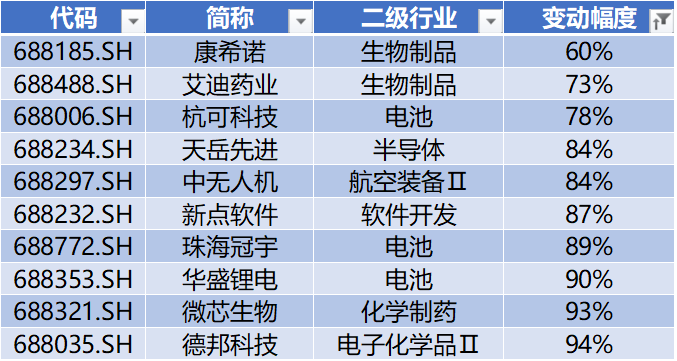 下降有28家,本文选取其中幅度最大的前十家(若不足十家则按实际数量列示),分别为:康希诺、艾迪药业、杭可科技、天岳先进、中无人机、新点软件、珠海冠宇、华盛锂电、微芯生物、德邦科技。