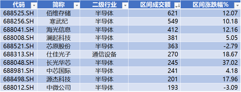 上表是本周成交额(亿)前十公司,分别为:佰维存储、寒武纪、海光信息、澜起科技、芯原股份、仕佳光子、长光华芯、中芯国际、源杰科技、中微公司。