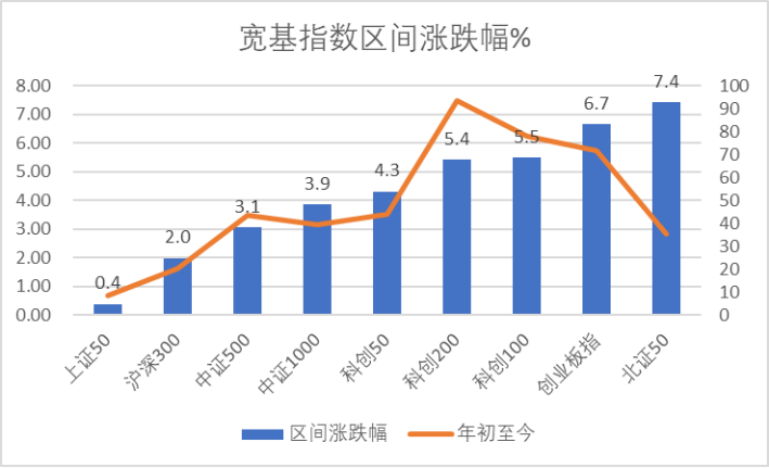 如上图,本周A股主要宽基指数呈现普涨,北证50涨7.4%居前,上证50居末,科创100、科创200、科创50分别涨:5.5%、5.4%、4.3%。