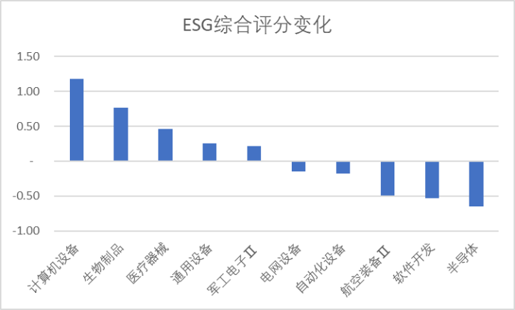上图是本周ESG评分变化行业分布,本文统计了排名最高和最低的5个行业,本周ESG评分变化排名变化最大的细分行业:计算机设备、生物制品、医疗器械。
