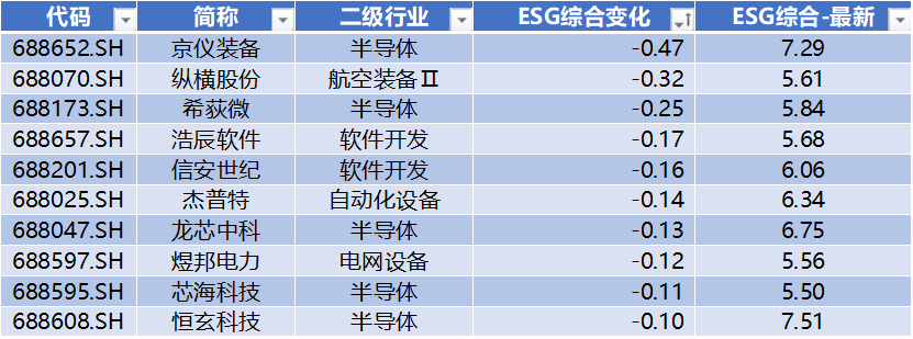 上表是ESG评分变化下降的前十家公司,分别为:京仪装备、纵横股份、希荻微、浩辰软件、信安世纪、杰普特、龙芯中科、煜邦电力、芯海科技、恒玄科技。