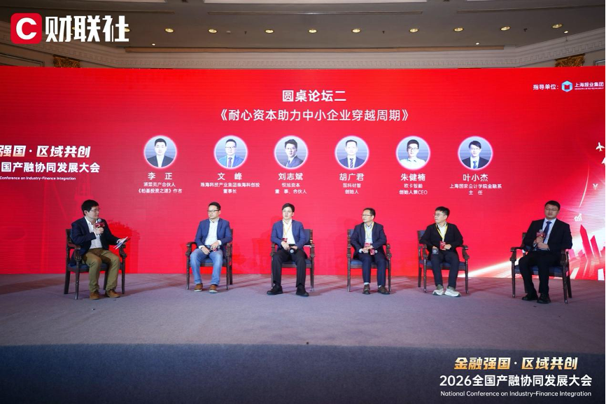 财联社4月19日讯 (记者 王彦琳) 4月17日,由财联社主办的“金融强国·区域共创”2026全国产融协同发展大会在上海举办,第二场圆桌论坛聚焦“耐心资本如何助力优质企业跨越周期”,由浦盟资产合伙人、《柏基投资之道》作者李正担任主持人,珠海科技产业集团珠海科创投董事长文峰,恒旭资本董事、合伙人刘志斌,国科材智创始人、中国科学院大学新材料校友联合会和北京化工大学新材料校友会秘书长胡广君、欧卡智舶创始人兼CEO朱健楠、上海国家会计学院金融系主任叶小杰五位嘉宾,围绕耐心资本的内涵、回报机制、GP与LP的错配、企业如何获得耐心资本等议题,展开了一场兼具理论深度与实战温度的对话。
