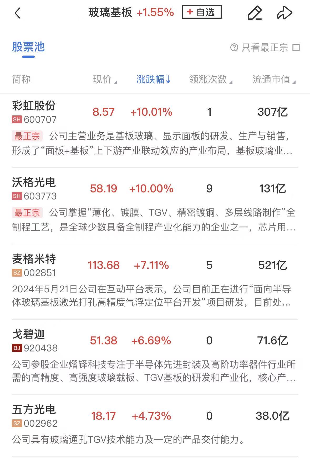 玻璃基板概念延续强势,沃格光电走出8天5板,续创历史新高,彩虹股份2连板,五方光电、帝尔激光、凯盛新能等个股跟涨。