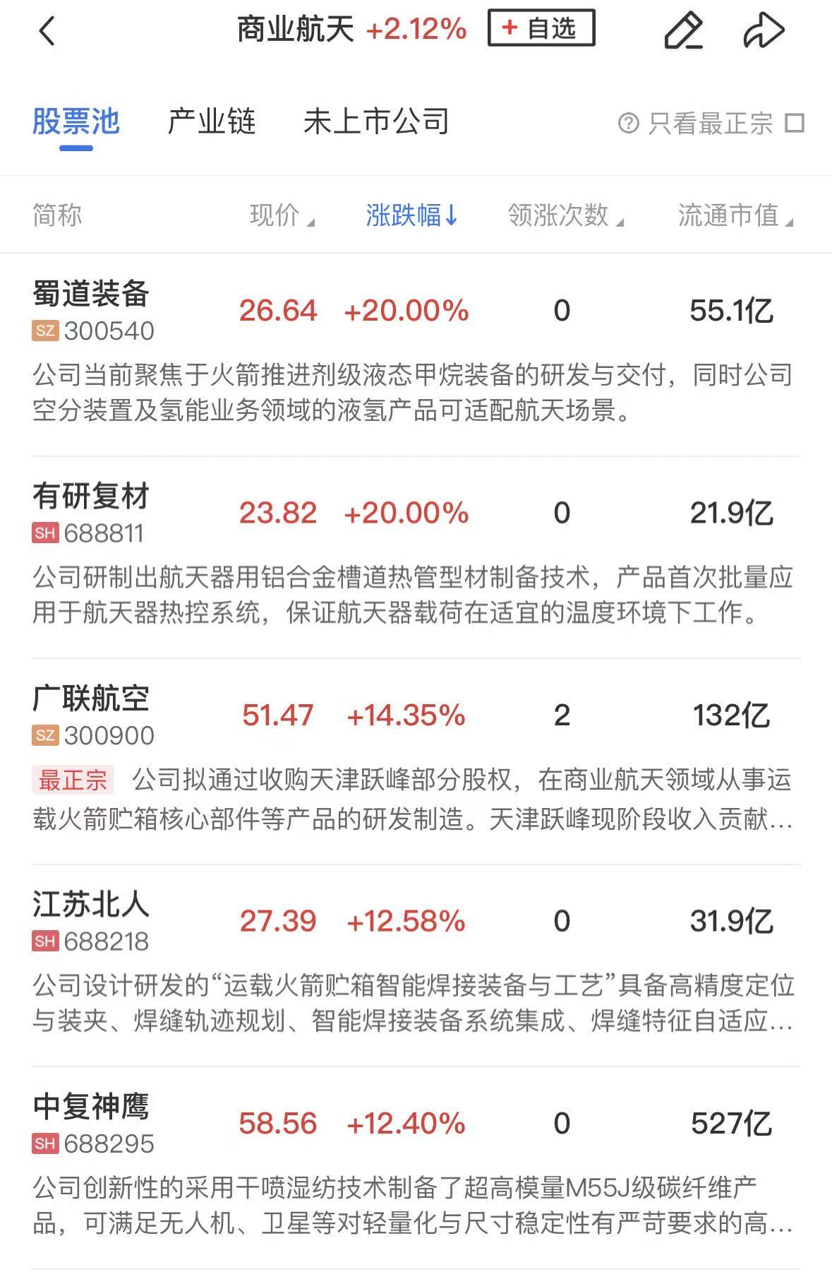 商业航天概念涨幅居前,中国卫星、博云新材、西部材料、中衡设计、有研复材涨停。广联航空、通光线缆、中国卫通、乾照光电等个股涨幅居前。