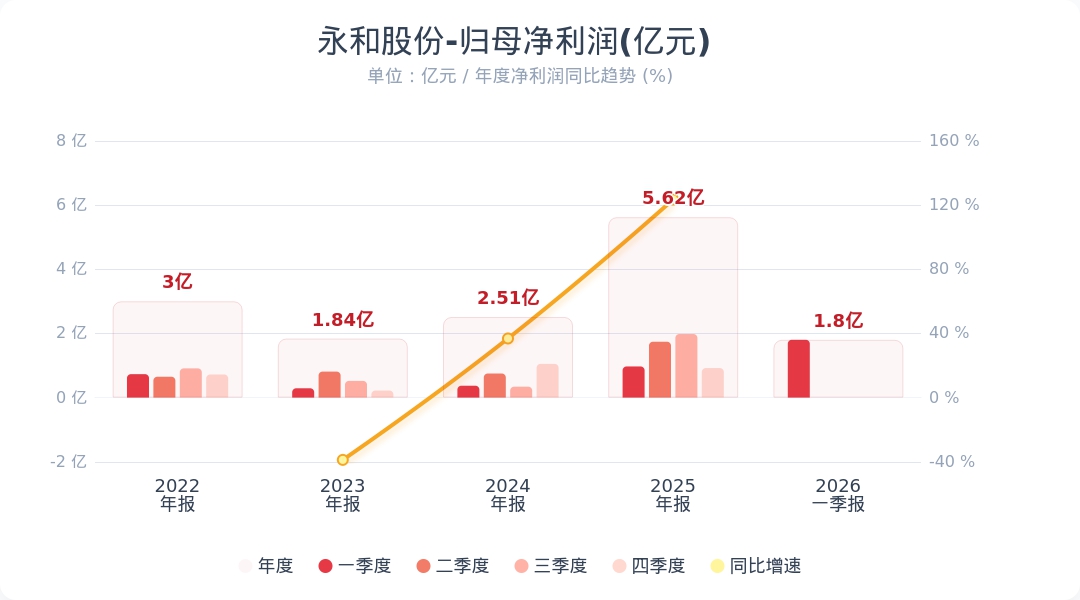 财联社4月20日电,永和股份(605020.SH)公告称,2026年第一季度实现营业收入13.24亿元,同比增长16.37%;归属于上市公司股东的净利润为1.80亿元,同比增长85.11%。业绩变动主要系主要受第三代制冷剂和部分含氟高分子材料产品价格上涨,毛利率上升引致。小财注:公司Q1净利润1.8亿,2025年Q4净利润0.92亿,据此计算,Q1净利润环比增长95%。