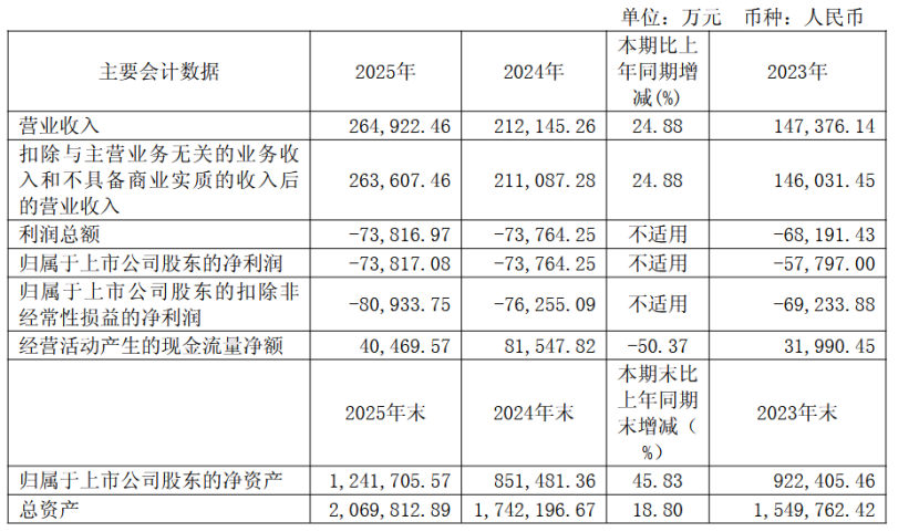 其年报显示,公司2025年实现营业收入26.49亿元,同比增长24.88%;实现净利润-7.38亿元。