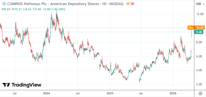 截至周一(4月20日)美股收盘,Compass Pathways plc(股票代码:CMPS)涨42.04%,录得2024年4月以来的最高收盘价。