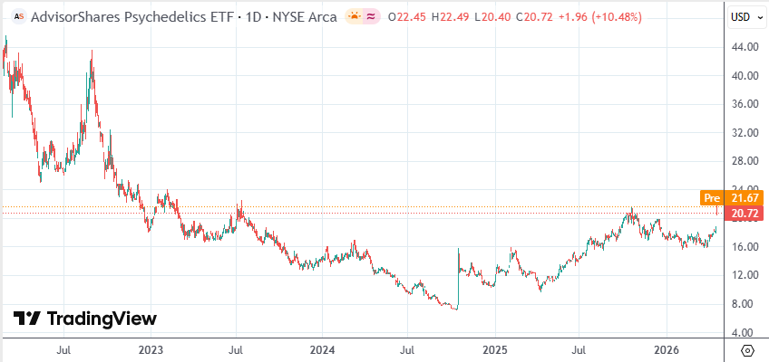 AdvisorShares Psychedelics ETF(PSIL,AdvisorShares迷幻药ETF)收涨10.48%,早盘一度涨20%报22.49美元,触及2022年10月以来的盘中最高水平。