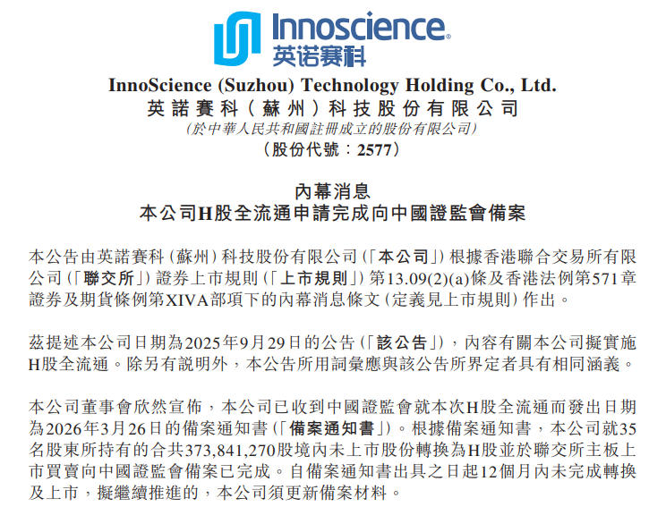 英诺赛科在14日发布公告称,已获得中国证监会关于H股全流通的备案通知书。此次转换涉及35名股东持有的约3.74亿股境内未上市股份(占总股本40.85%),转换完成后,英诺赛科H股总股本将增至约8.99亿股,占总股本比例超98%,极大地提升了股票的市场流动性和国际投资者的参与度。