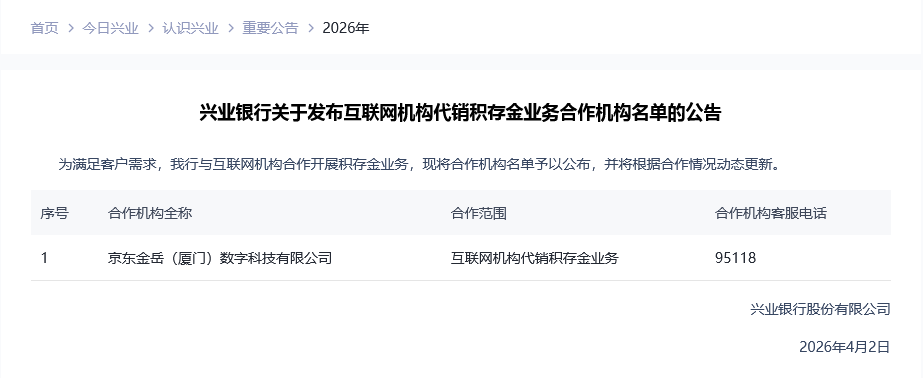 比如今年4月初,兴业银行在官网发布了《兴业银行关于发布互联网机构代销积存金业务合作机构名单的公告》,表示为满足客户需求,该行与互联网机构合作开展积存金业务,合作机构为京东金岳(厦门)数字科技有限公司。