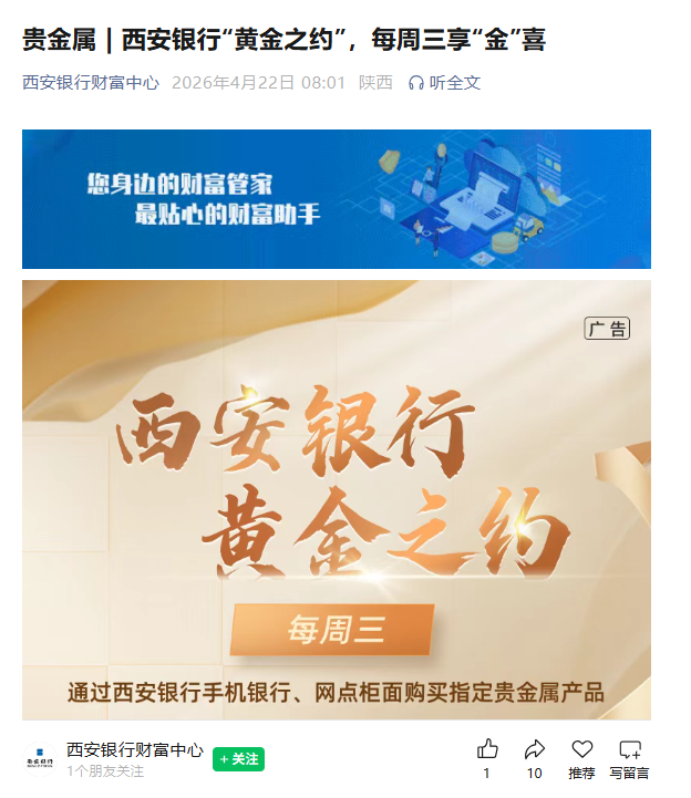 今日上午8点,西安银行财富中心在官方微信公众号发布了“每周三享‘金’喜”的贵金属业务例行公告。