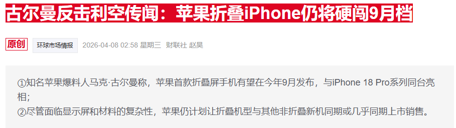 根据古尔曼先前的爆料,苹果已准备在今年秋季推出折叠屏iPhone,并正在开发多款新的家用设备和可穿戴产品。