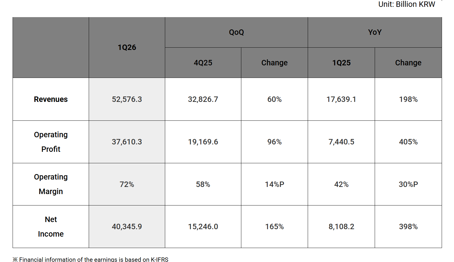 财报显示,在强劲的人工智能需求推动下,公司产品价格持续飙升,再次创下季度利润和营收新高,季度营收首次突破50万亿韩元,营利率更是一骑绝尘。
