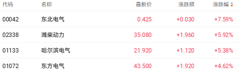 财联社4月23日讯(编辑 胡家荣)港股电气设备板块今日表现亮眼,多只个股涨幅显著。截至发稿,东北电气(00042.HK)涨7.59%,哈尔滨电气(01133.HK)涨5.38%,潍柴动力(02338.HK)涨5.92%,东方电气(01072.HK)涨4.62%。