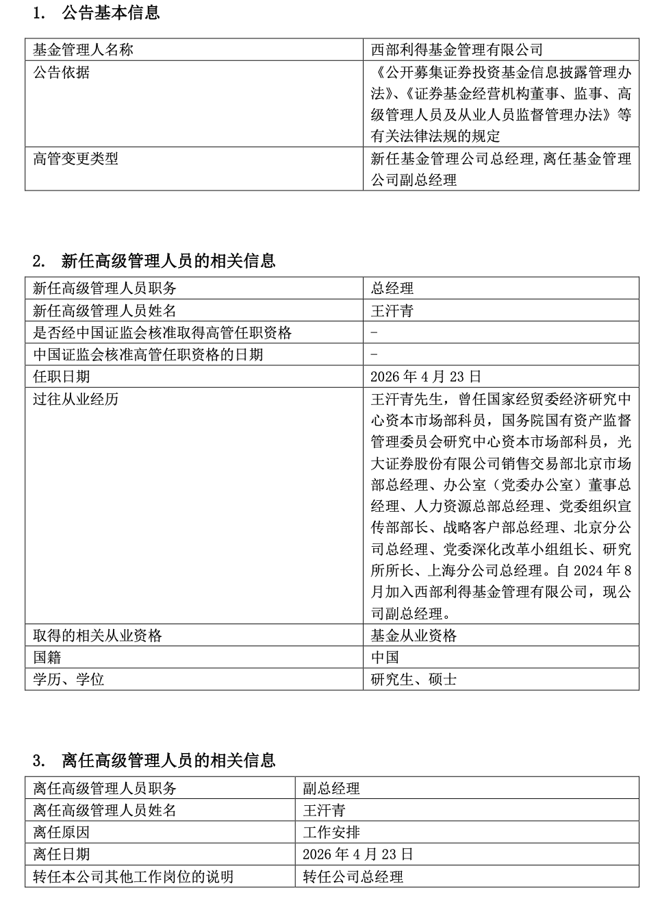 王汗青正式履新,西部利得完成核心管理层更替