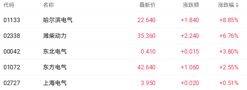 截至收盘,哈尔滨电气(01133.HK)涨8.85%,潍柴动力(02338.HK)涨6.76%,东北电气(01072.HK)涨3.80%。