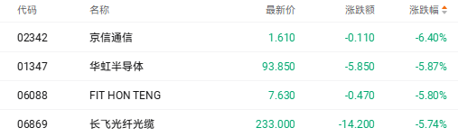 截至收票,京信通信(02342.HK)跌6.40%,长飞光纤光缆(06869.HK)跌5.74%,剑桥科技(06166.HK)跌4.66%。