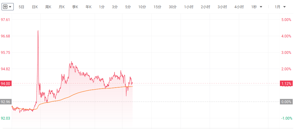 截至发稿,WTI石油今日小幅反弹,目前处于94美元附近。