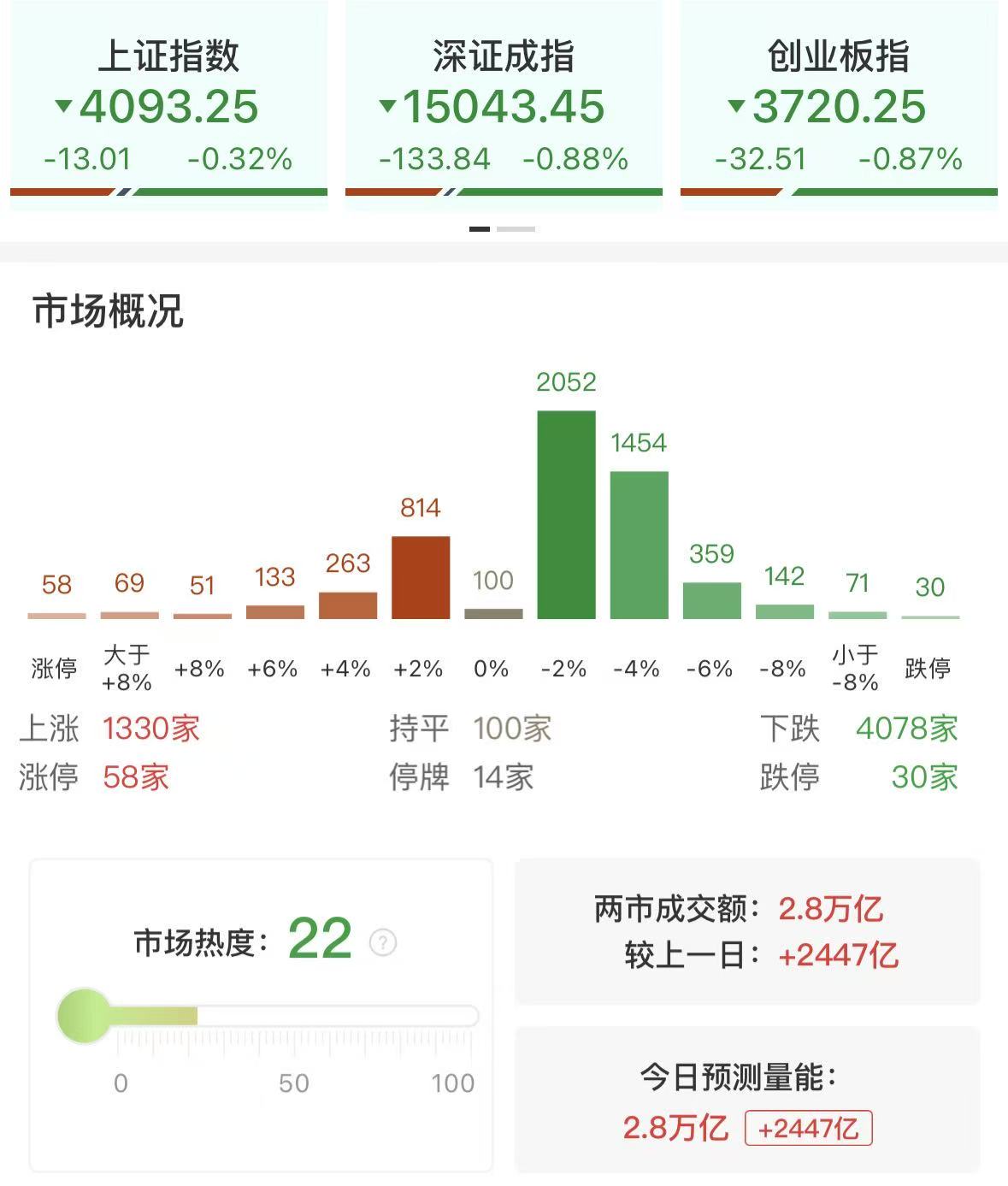 财联社4月23日讯,市场震荡调整,创业板指、深成指盘中跌超1.5%,沪指跌破4100点,止步5连阳。中际旭创盘中总市值站上万亿。量能明显放大,沪深两市成交额2.8万亿,较上一个交易日放量2447亿。盘面上,市场热点较为杂乱,全市场近4100只个股下跌。从板块来看,防御性板块走强,其中大消费方向的白酒、零售概念逆势活跃,迎驾贡酒、中兴商业涨停。绿电概念快速拉升,华电辽能3连板,节能风电、绿发电力涨停,粤电力A触及涨停。油气概念快速走高,山东墨龙涨停。下跌方面,有色金属板块调整,西藏珠峰、中稀有色跌停,湖南白银等纷纷下挫。截至收盘,沪指跌0.32%,深成指跌0.88%,创业板指跌0.87%。