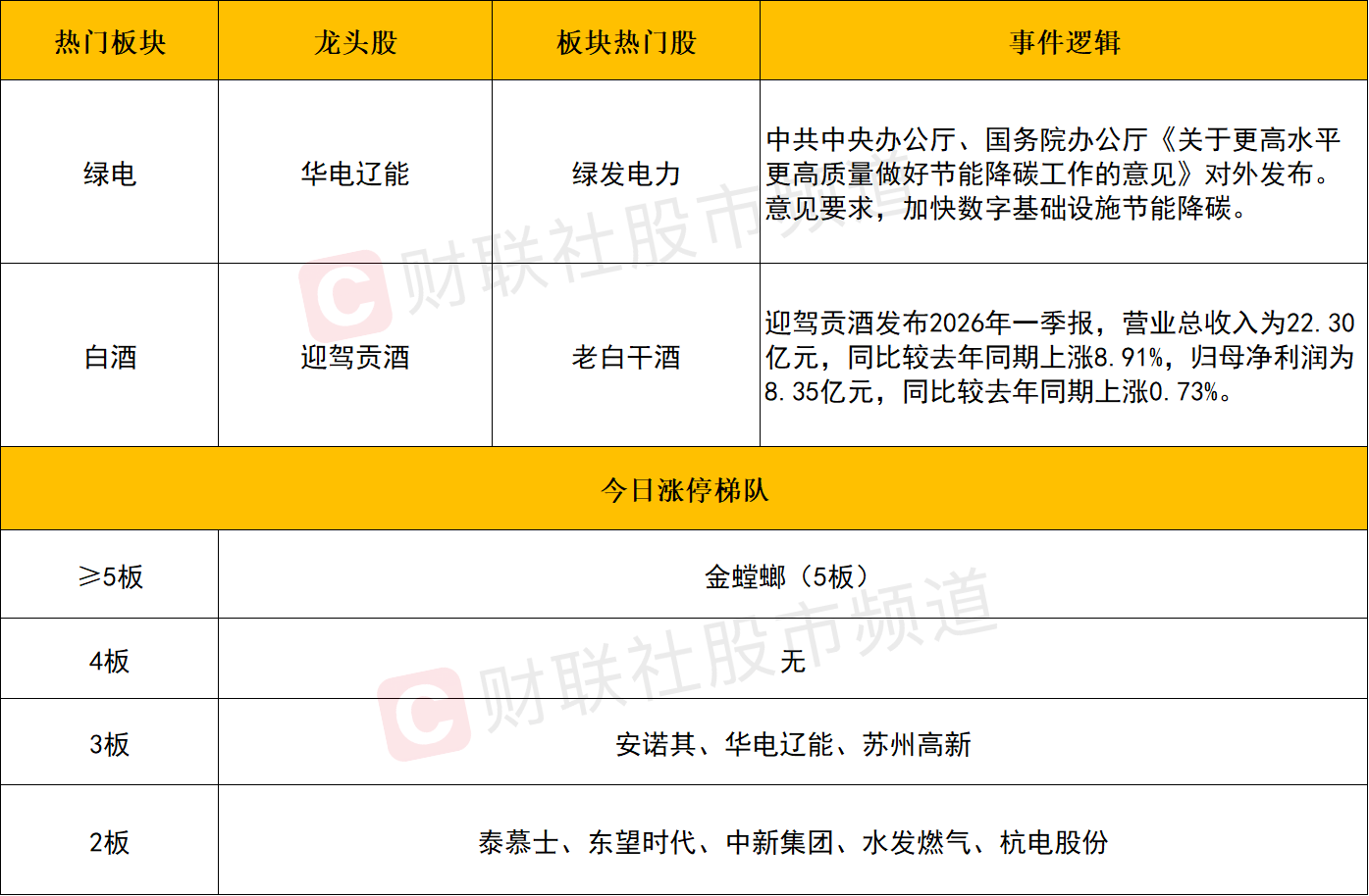 大消费板块展开反弹,白酒表现活跃,迎驾贡酒涨停,老白干酒、皇台酒业、山西汾酒、古井贡酒、金种子酒等个股涨幅居前。消息面上,迎驾贡酒发布2026年一季报,营业总收入为22.30亿元,同比较去年同期上涨8.91%,归母净利润为8.35亿元,同比较去年同期上涨0.73%。