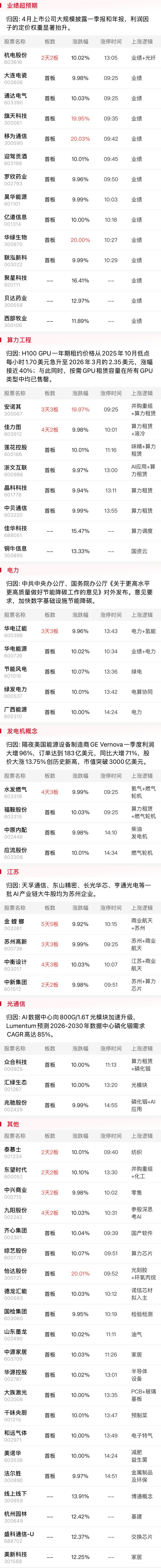 中办、国办发布《关于更高水平更高质量做好节能降碳工作的意见》,要求加快数字基础设施节能降碳。算电协同概念强势领涨绿电概念,其中前期人气股华电辽能以地天板形式实现晋级3连板,并创出阶段新高,此前曾发布转型算力计划的晶科科技、绿发电力等多股涨停,粤电力A也一度实现反包板。而此前屡有不俗表现的国产算力方向今日同样可圈可点,算力租赁概念莲花控股、中贝通信、佳力图、浙文互联均实现反包板,10厘米人气股利通电子继续刷新历史高点。算力芯片方面,龙芯中科、中国长城等CPU标的逆势冲高外,以太网交换机芯片股盛科通信收盘大涨12%。在以“超节点”的形式被极致堆叠已经被视为国产算力弯道超车的捷径,但需要注意,若算力出海方向的上升趋势遭遇破坏,对于国产算力产业链而言也难以独善其身。