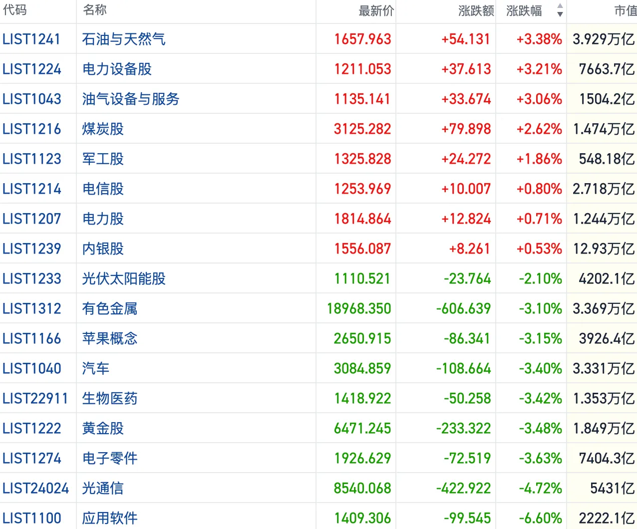 上涨的板块中,石油、天然气等能源股再度走强,反映市场重新关切地缘影响。