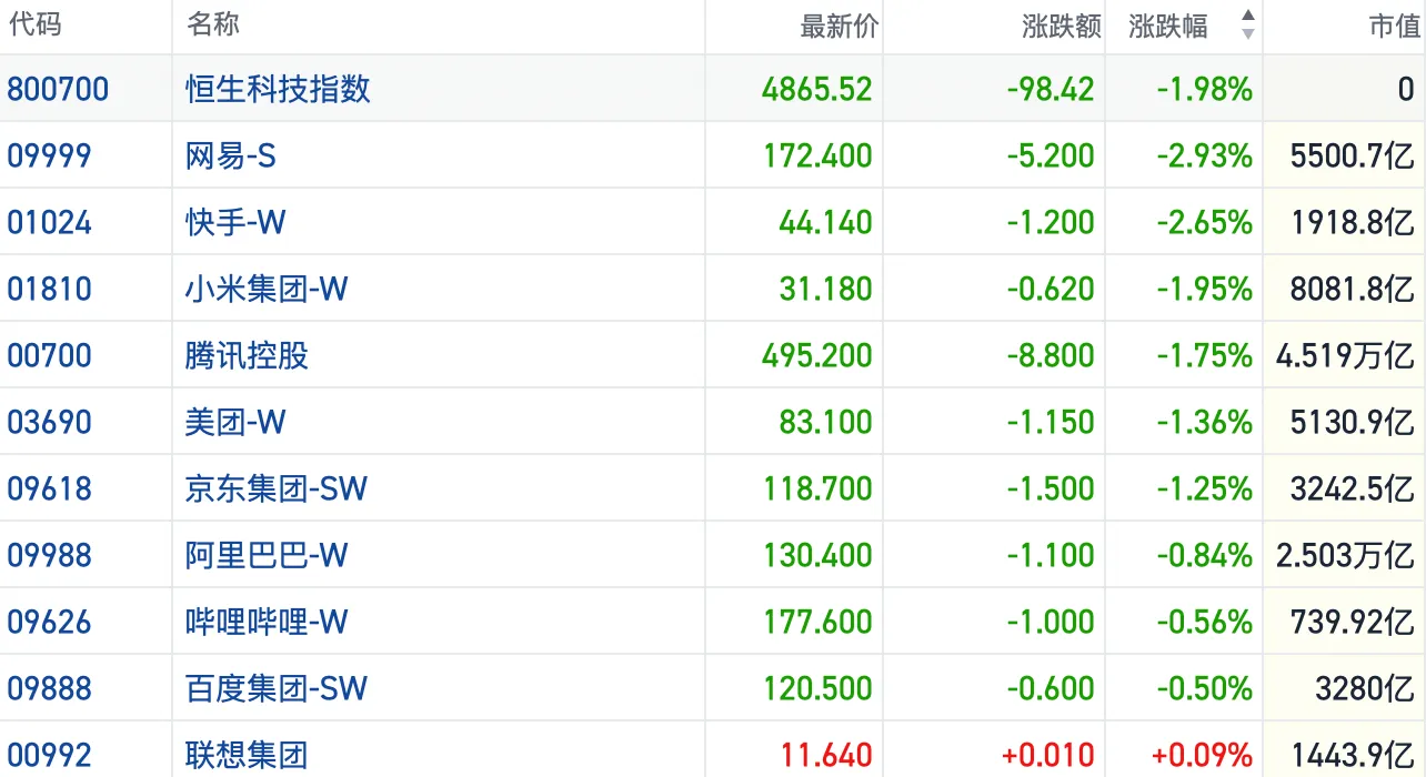 盘面上,大型科技股承压明显加重,网易跌近3%,小米、腾讯跌近2%,京东、美团跌超1%,百度、腾讯均有跌幅。