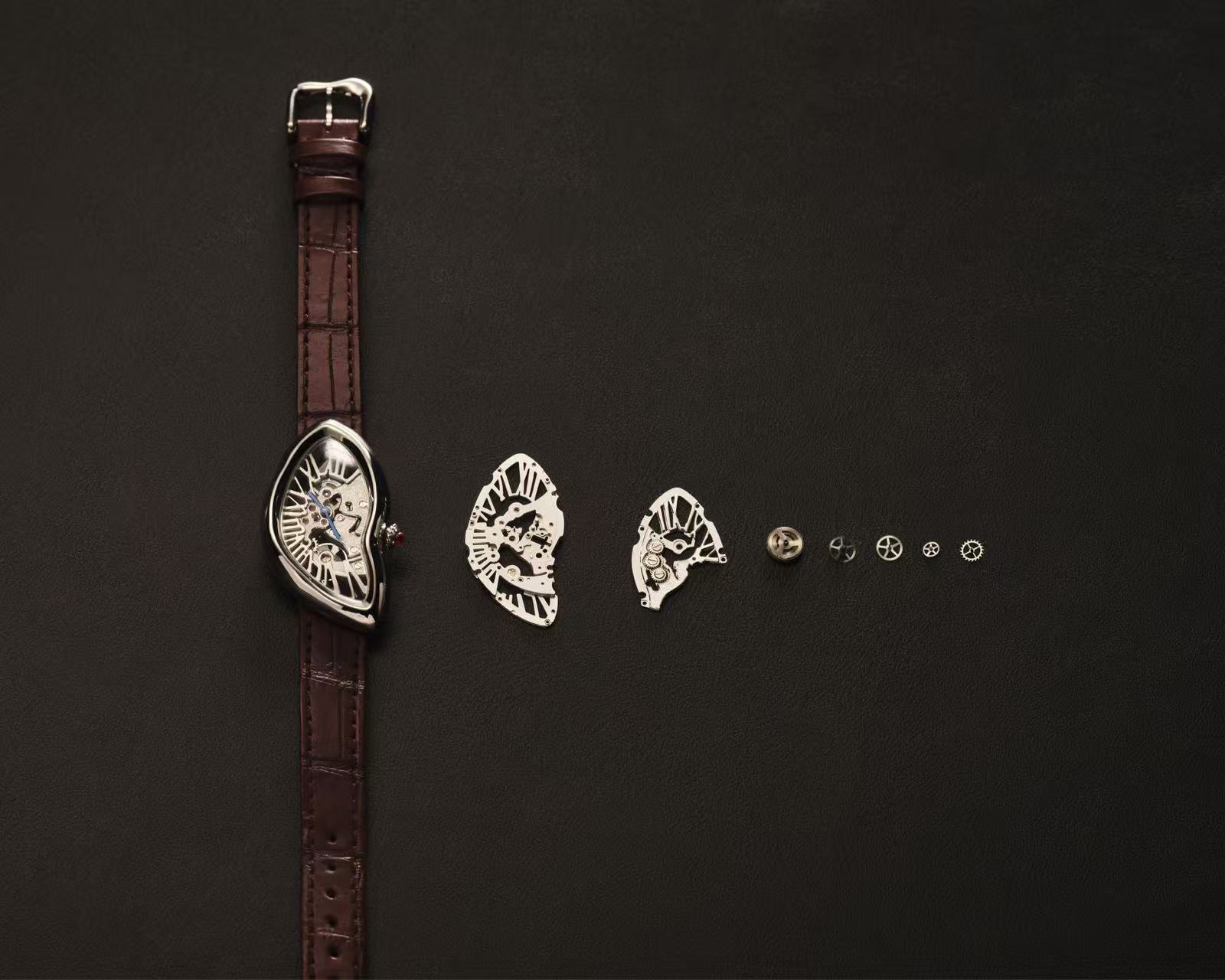 Crash镂空腕表则以全新的镂空结构,再度演绎了1967年诞生的不对称Crash腕表。腕表采用卡地亚特别研发的1967 MC型工作坊精制手动上链机械机芯,机芯的活动部件与桥板融为一体,罗马数字时标造型于桥板上呈现。与此同时,腕表造型的扭曲效果更为鲜明,呈现出强烈的视觉张力。延续Crash腕表始终限量发行的传统,全新Crash镂空腕表编号并限量发行150枚。