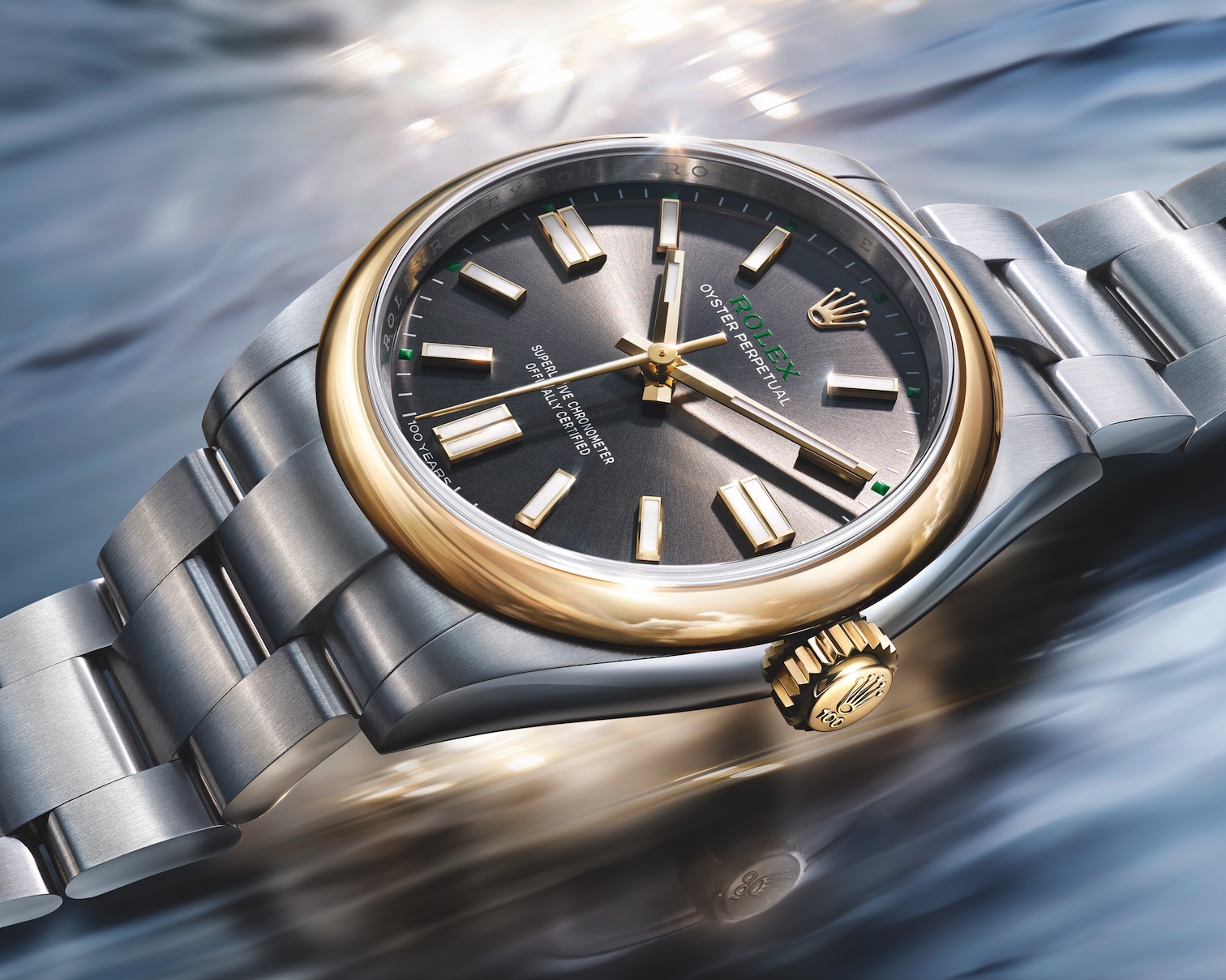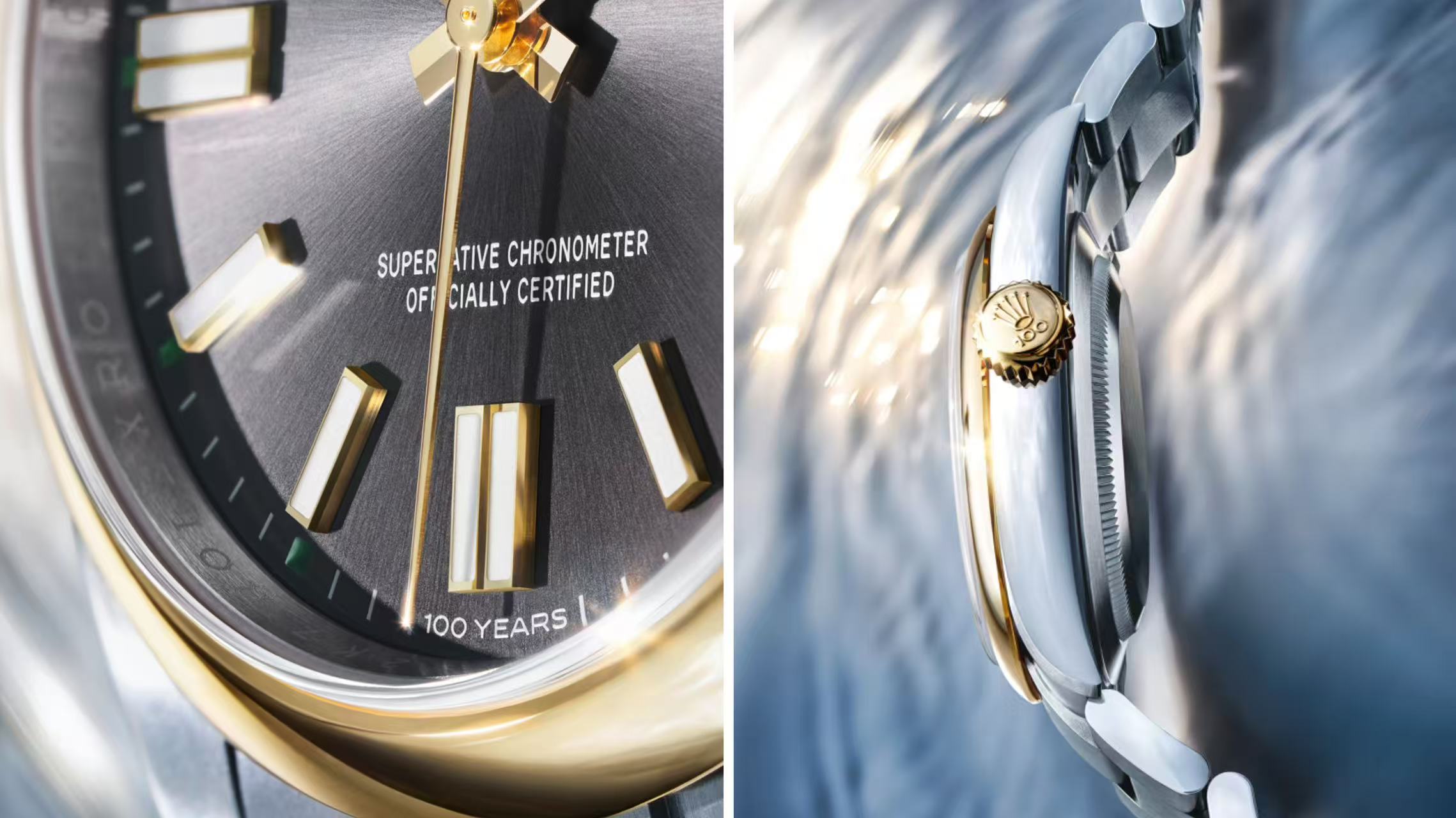 对百年历程的致敬体现在了各处。上链表冠镌刻数字“100”字样;灰色表盘6点钟位置以“100 YEARS”(一百周年)字样,取代了传统的“SWISSMADE”(瑞士制造)标识。一如此前多枚劳力士周年纪念表款,品牌标志性的绿色也在新款上出现,劳力士标志与分钟刻度盘上的5分钟标记均采用绿色,以移印工艺呈现。