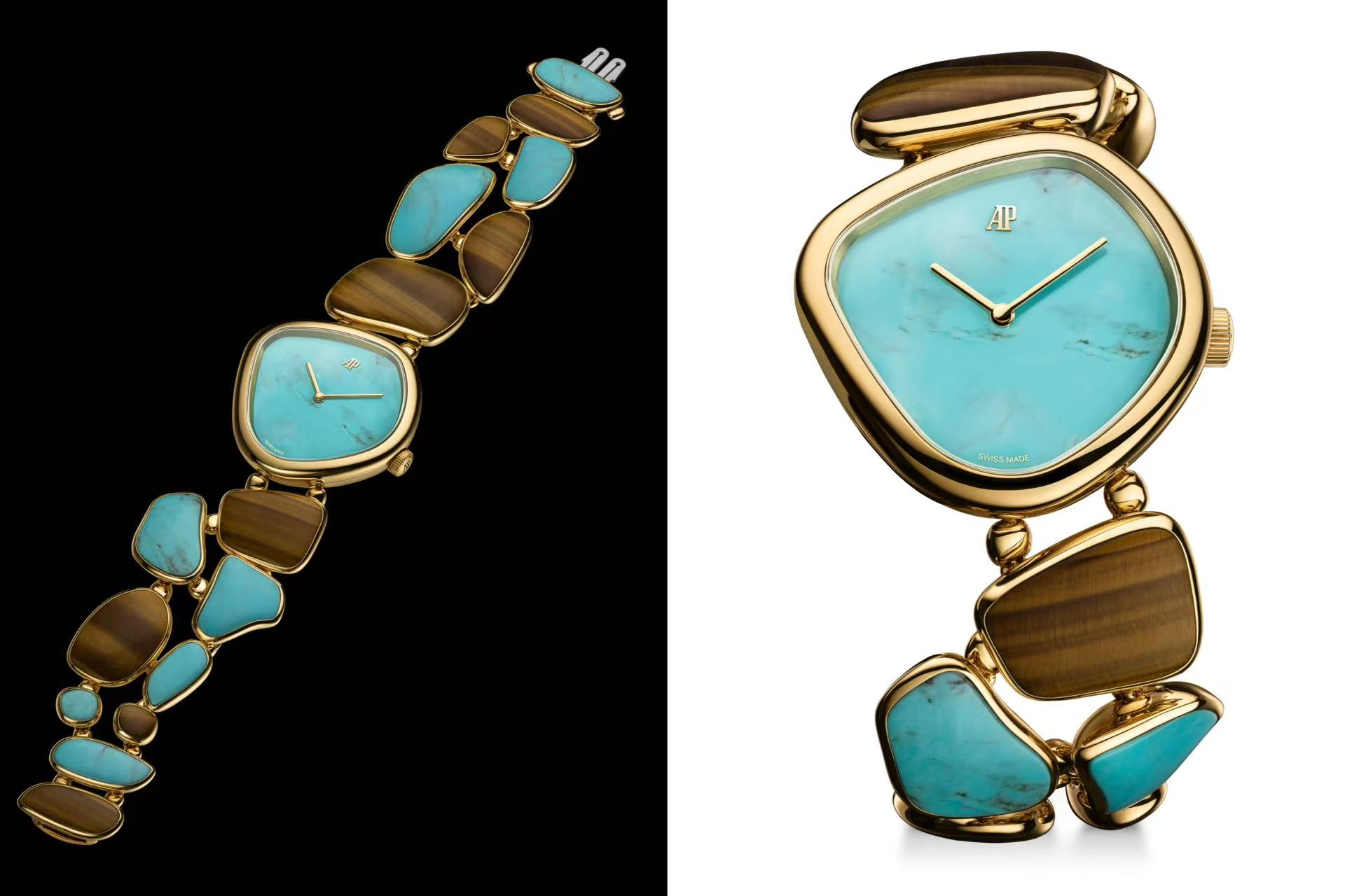 为庆祝项目启幕,爱彼在表展现场呈现工坊首批三款新作。“Établisseurs Galets鹅卵拾光”腕表灵感取自汝山谷的自然景致,造型宛若汝湖湖水冲刷打磨成形的圆润卵石。18K黄金表壳搭载Calibre 3098手动上链机芯,椭圆形天然宝石表盘之下,链带由形态各异的链节组成,每一枚均镶嵌宝石,彼此以微型金质球形关节相连,随腕部动作灵活转动。此款将于2026年推出五种天然宝石组合。