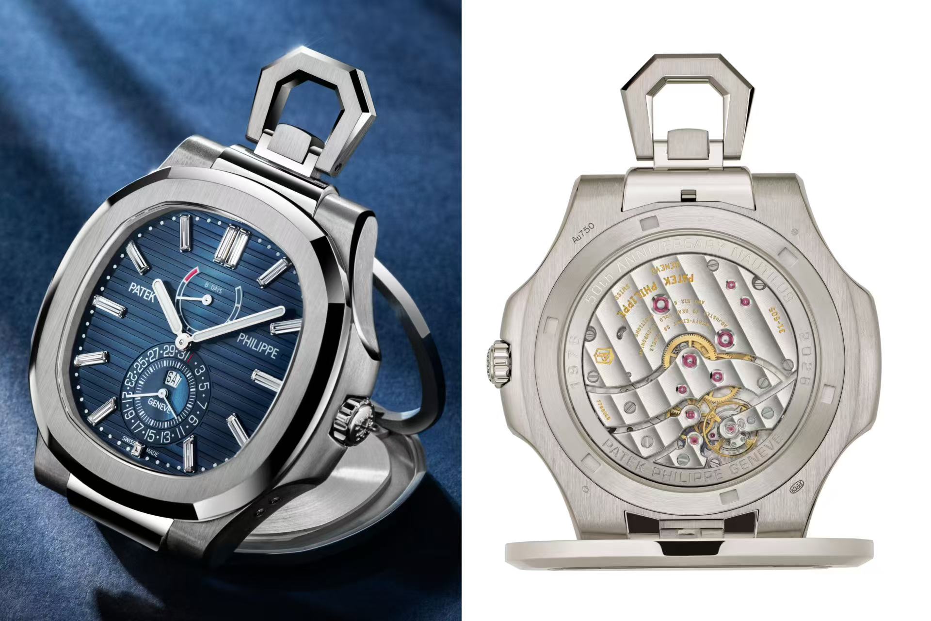 防尘盖下方背面圆环镌刻“50th Anniversary Nautilus 1976–2026 Patek Philippe”字样。透过蓝宝石水晶透盖,手动上链机芯Caliber 31-505 8J PS IRM CI J一览无遗。双发条盒串联提供至少8天动力储存,座钟限量100枚。
