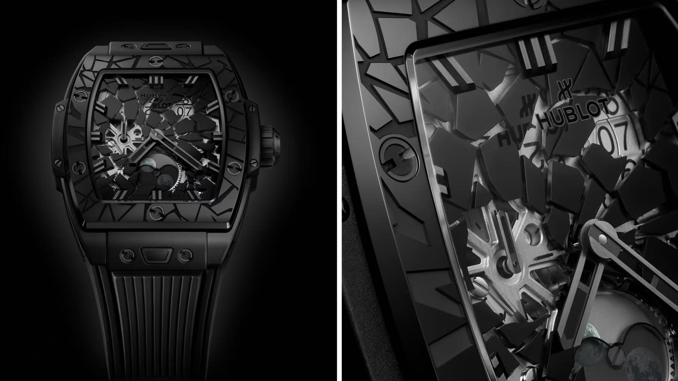 二十年前,宇舶表发布了第一枚"全黑"(All Black)腕表,主张通过同色系中微妙的材质对比彰显腕表美学。今年,低调内敛的黑色视觉继续升华为大胆宣言,全新发布的Big Bang灵魂Impact全黑腕表以微珠喷砂及抛光黑色陶瓷打造,两种工艺交织呈现独特纹理与微妙光影,诠释宇舶表“不可见之可见”的设计哲学。42毫米酒桶形表壳承袭Big Bang系列的设计基因,搭载HUB1770镂空自动上链机芯,配备6点钟镂空月相显示与1点钟大日历显示窗,提供50小时动力储存。限量100枚。
